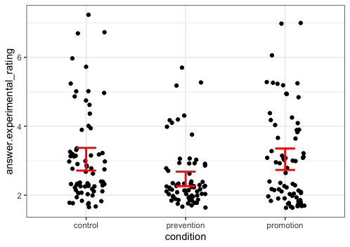 In the original study prevention group was predicted to have high ratings while promotion group should have had low ratings – as you can see, the situation is reversed. (Just like the Data Colada folks show once they remove suspicious observations from the study.)