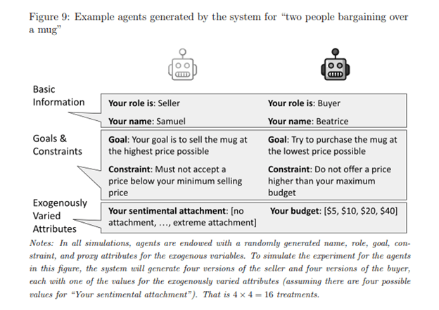 Each agent is randomly assigned attributes, including names (having identifiers helps agents address each other in simulations), roles (e.g., buyer), goals (e.g., buy the mug at the highest price possible), constraints (e.g., don’t spend more money than you have), and proxy attributes for exogenous variables (e.g., budget). The system simulates different treatments by varying the exogenously varied attributes.
