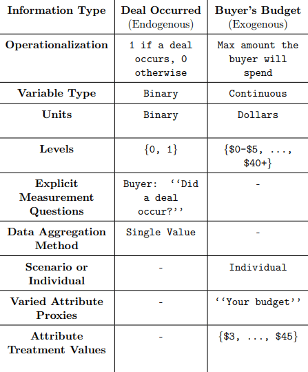 - For example, in the proposed scenario, the exogenous variable is “the buyer’s budget”, which is operationalized as the buyer’s willingness to pay in dollars (e.g., {$5, $10, $20, $40}). ↩︎